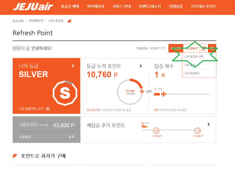 제주항공 포인트 환불 홈페이지에서 신청하는법 첫번째 홈페이지 로그인후 우측에 상단에 보이는 리프레시 포인트를 클릭해주세요!