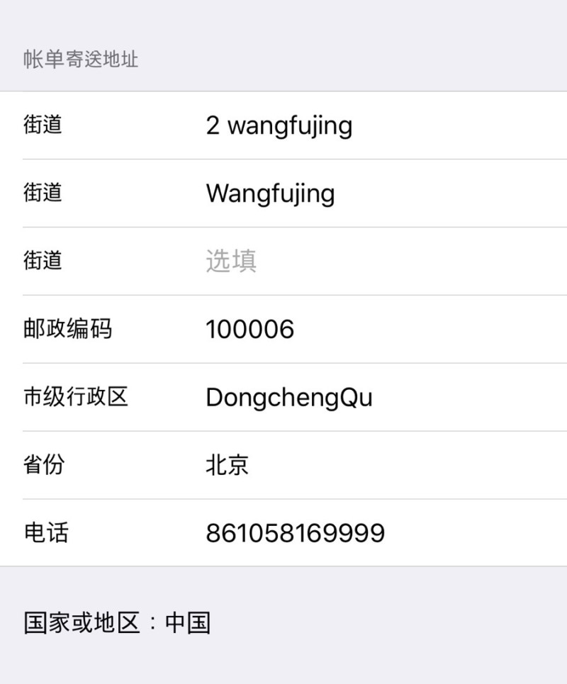 그럼 위에 국가/지역 보이시나요? 국가/지역을 눌러서 카드, 사는곳을 설정해야하는데 자신의 실거주지를 넣어야하는가? 노노! ㅋㅋ 그렇지 않고 그냥 실존해 있는 주소를 넣어야하는데 전 북경에 한 호텔 주소를 인터넷에 알아 본 후 입력을 했습니다. 뭐 여러분들도 그대로 따라하셔도 무방할 것 같습니다.