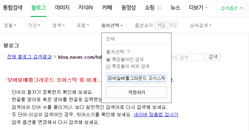 실제 블로그탭에 들어가서 출처선택을 누른 후 '특정출처만 검색'을 클릭해서 제목을 복사하여 붙여넣기를 합니다. 하지만 역시 나오지 않았습니다. 정말 글을 작성했는데도 불구하고 이렇게 노출이 안되면 힘이 빠집니다...
