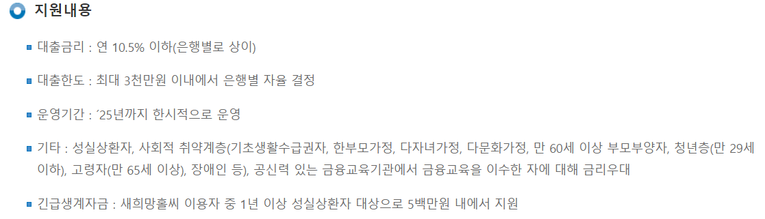 -긴급생계자금 : 새희망홀씨 이용자 중 1년 이상 성실상환자를 대상으로 5백만원 내에서 지원이 가능합니다.