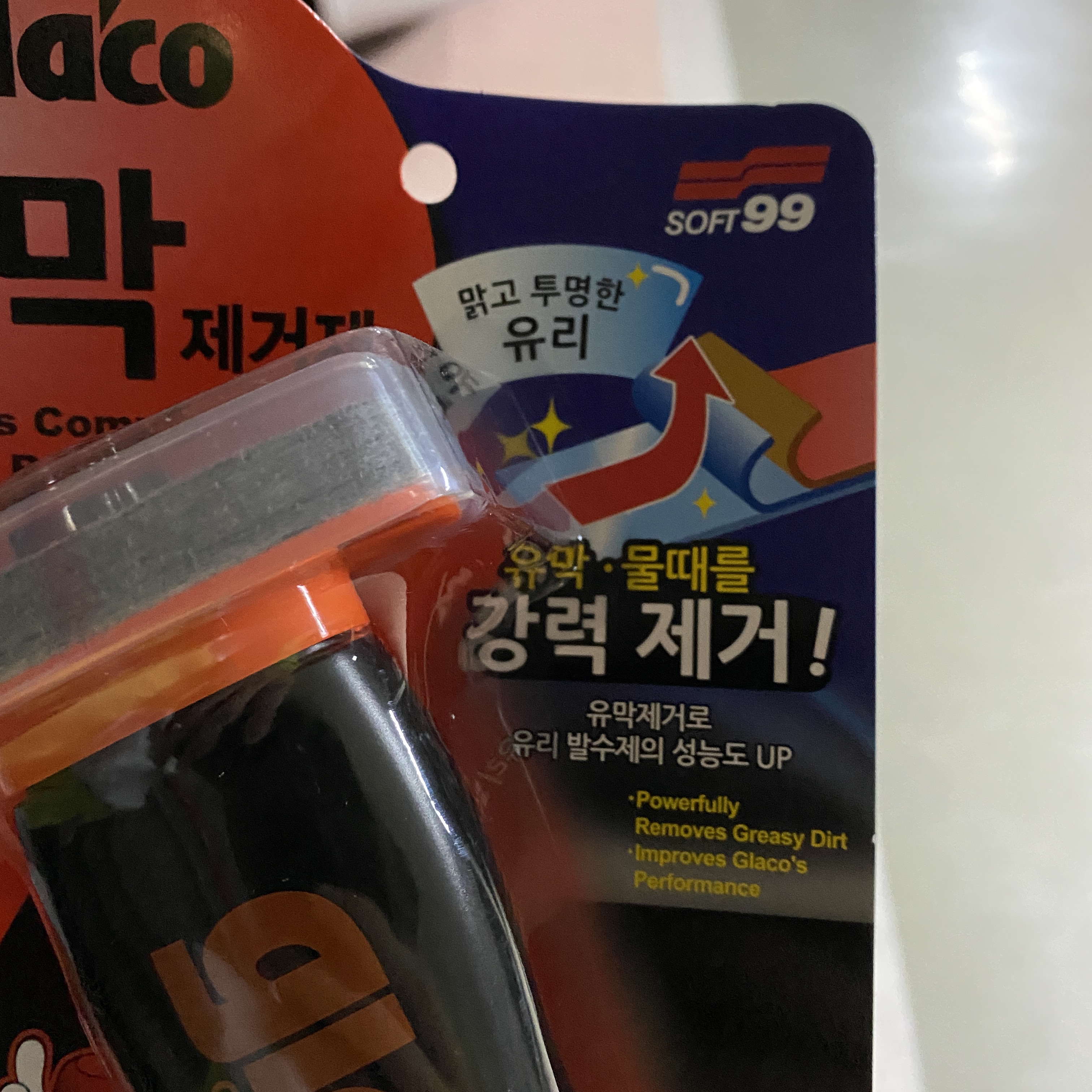제품 특징으로는 '소프트 99 유막제거제, 특수 연마 소재로 바르기만해도 유막 제거, 세정제로 지워지지 않았던 물때, 찌든때를 깨끗이 제거, 불소코팅된 유리면의 코팅제거 기능, 보호캡이 있어 보관이 용이'하다는 것이 있습니다. 사용법은 워낙 간단해서 제가 아래 상세하게 설명을 드리도록 하겠습니다.