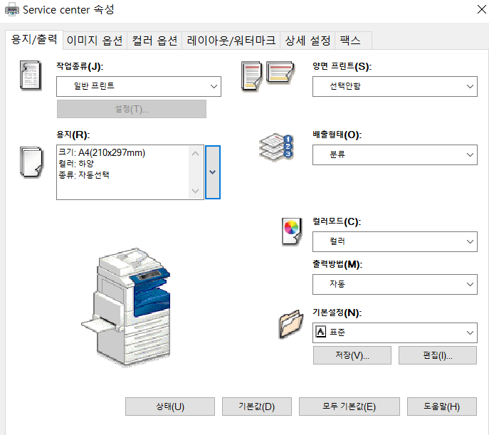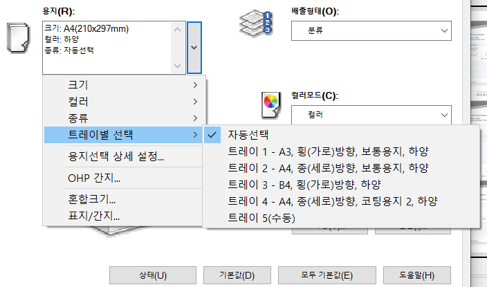 속성에 들어가면은 용지(R)부분에 화살표를 클릭하면 크기, 컬러, 종류, 트레이별 선택이 있고 웬만하면 자동선택을 하면은 거기에 맞게끔 용지가 나오는데 안나오니 트레이별 선택에서 트레이2-A4를 강제 선택해서 진행을 했지만 위와 마찬가지로 지속적인 에러가 발생을 하게 됐습니다. 하지만 버튼 1번으로 깔끔하게 해결했습니다.