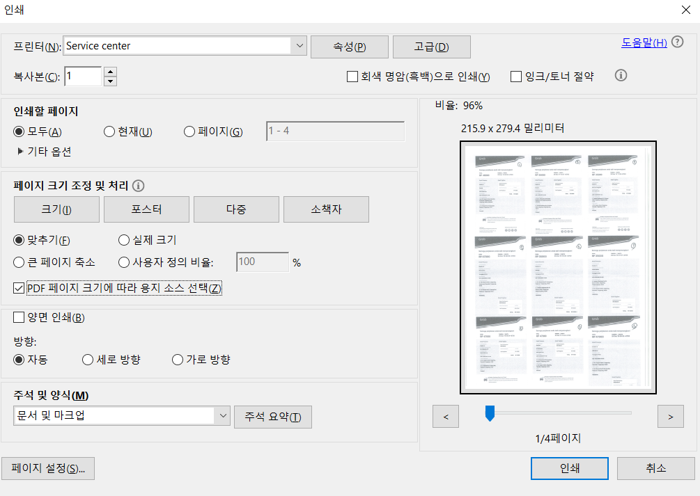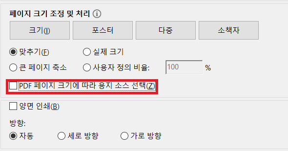 바로 인쇄를 눌렀을 때 'PDF 페이지 크기에 따라 용지 소스 선택'이라는 버튼을 해제하면 됐습니다. 아무리 상세설정을 한다해도 이 버튼을 누르면은 PDF 페이지 크기에 맞춰서 자기 멋대로 트레이를 설정하고 크기를 설정하는 것이였습니다. 정확한 이유는 모르겠지만 저와 같은 현상이 있을 경우에는 위에 버튼을 해제하시고 출력을 하시면은 상세설정에 기본값대로 출력이 됩니다! 어렵지 않죠? 이상 PDF인쇄 용지 및 트레이 설정 오류 간단한 해결방법이였습니다.