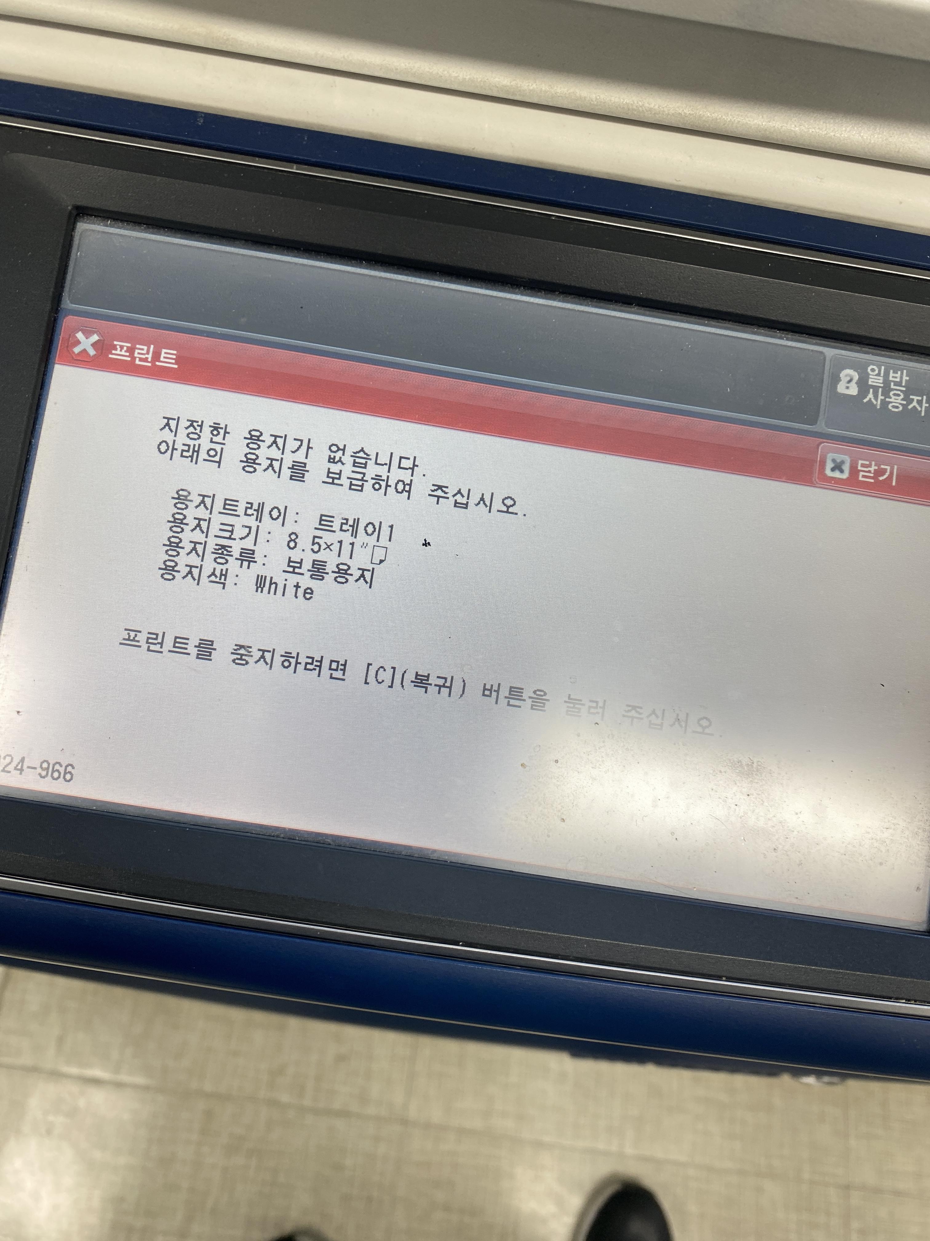 1번 트레이는 A3, 2번 트레이는 A4인데 A4를 출력하기 위해서 아무리 설정을해도 출력 후 오류메세지가 뜨면서 1번 트레이에 지정한 용지가 없습니다라는 문구만 반복됐습니다. 하지만 진짜 버튼 하나로 금방 해결이 되버린 어이없는 상황이.. 저와 같이 PDF인쇄할때 용지 및 트레이 오류가 발생할 때 스트레스받지 말라고 해결방법 알려드리겠습니다.