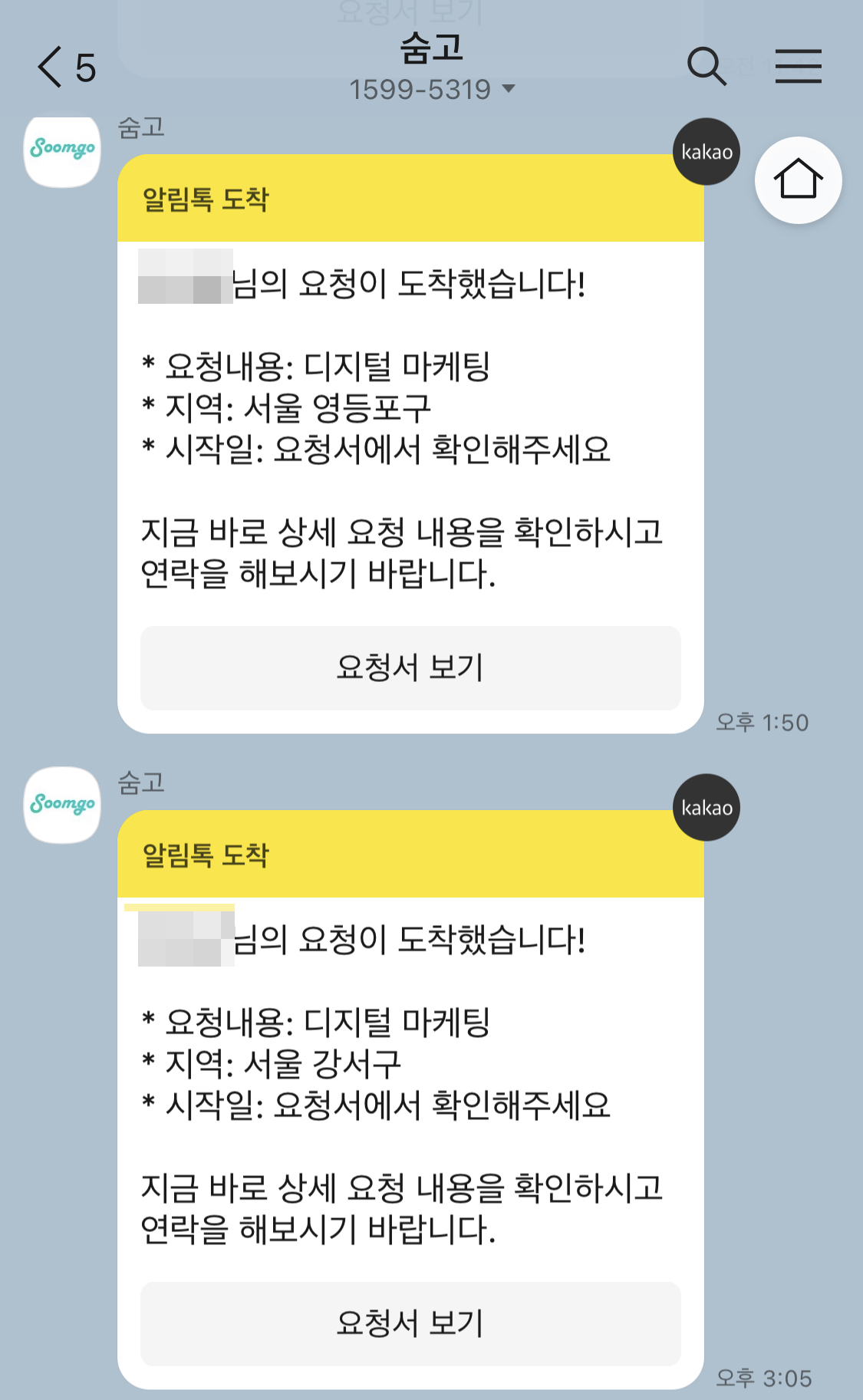 우선 숨고에 가셔서 고수 프로필을 등록을 하셔야 합니다. 저는 네이버블로그 강의 및 디저털마케팅으로 등록을 했습니다. 그렇게 등록을 해놓으면 제가 등록한 요청내용 부분에 고수를 찾는 분들이 있다면 위에처럼 카톡으로 '요청서 보기'가 옵니다.