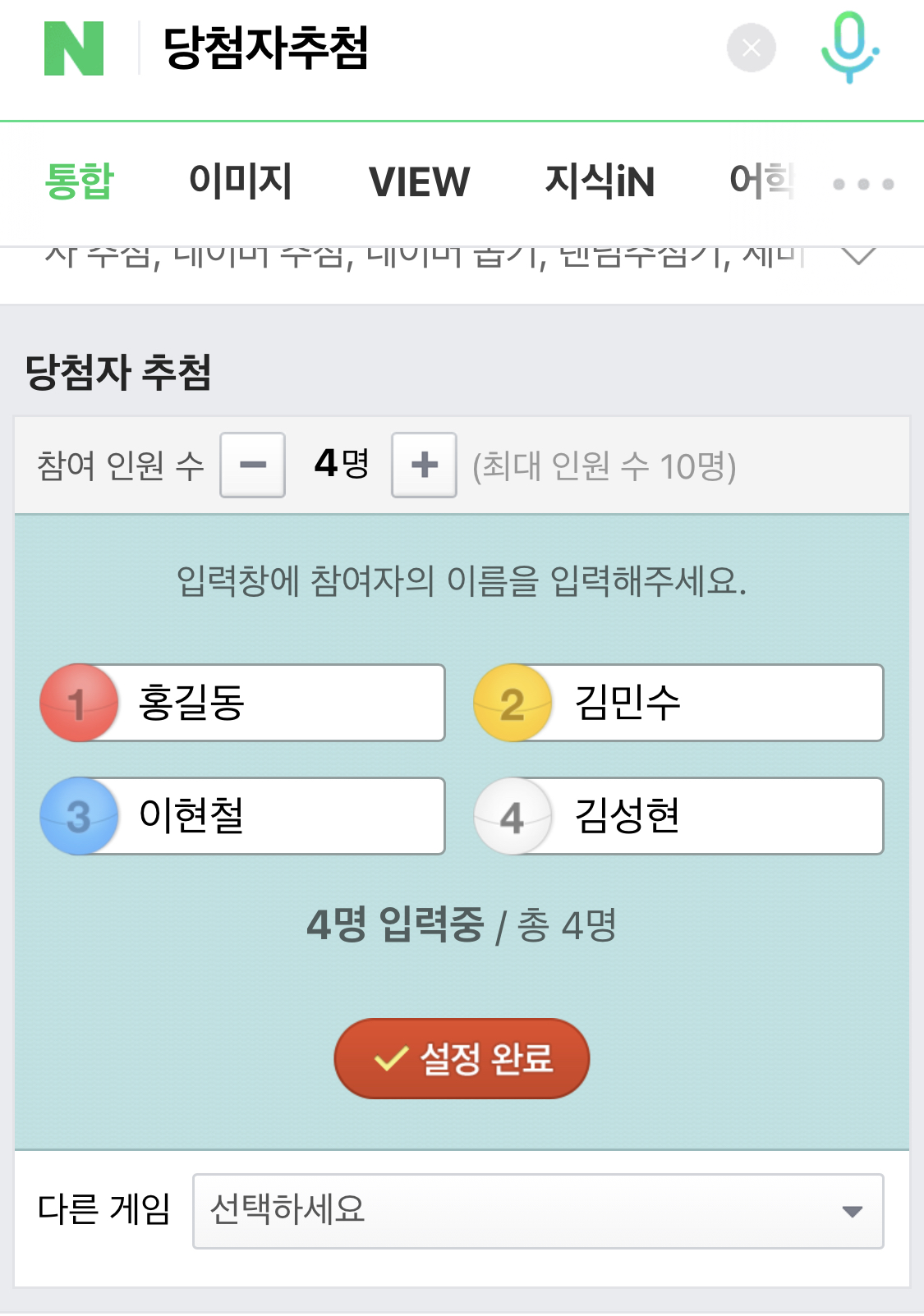 당첨자추첨은 우리가 로또에서 꺼내는 공을 가상으로 만든다고 보시면 됩니다. 우선 참여인원수를 선택을 할 수 있는데 만약에 전 4명(홍길동, 김민수, 이현철, 김성현)이 있다면 참여인원수를 4명으로 지정한 후 '설정완료'를 눌러줍니다.