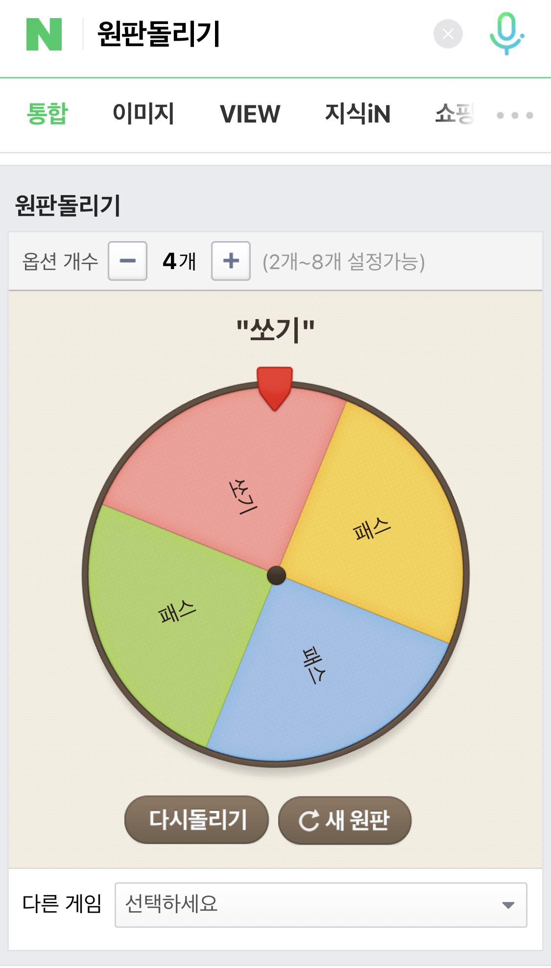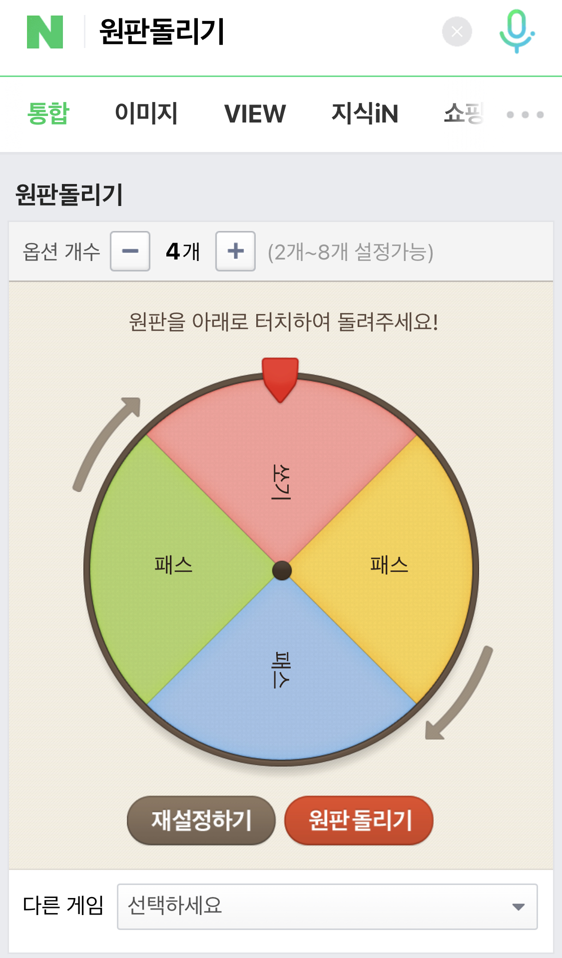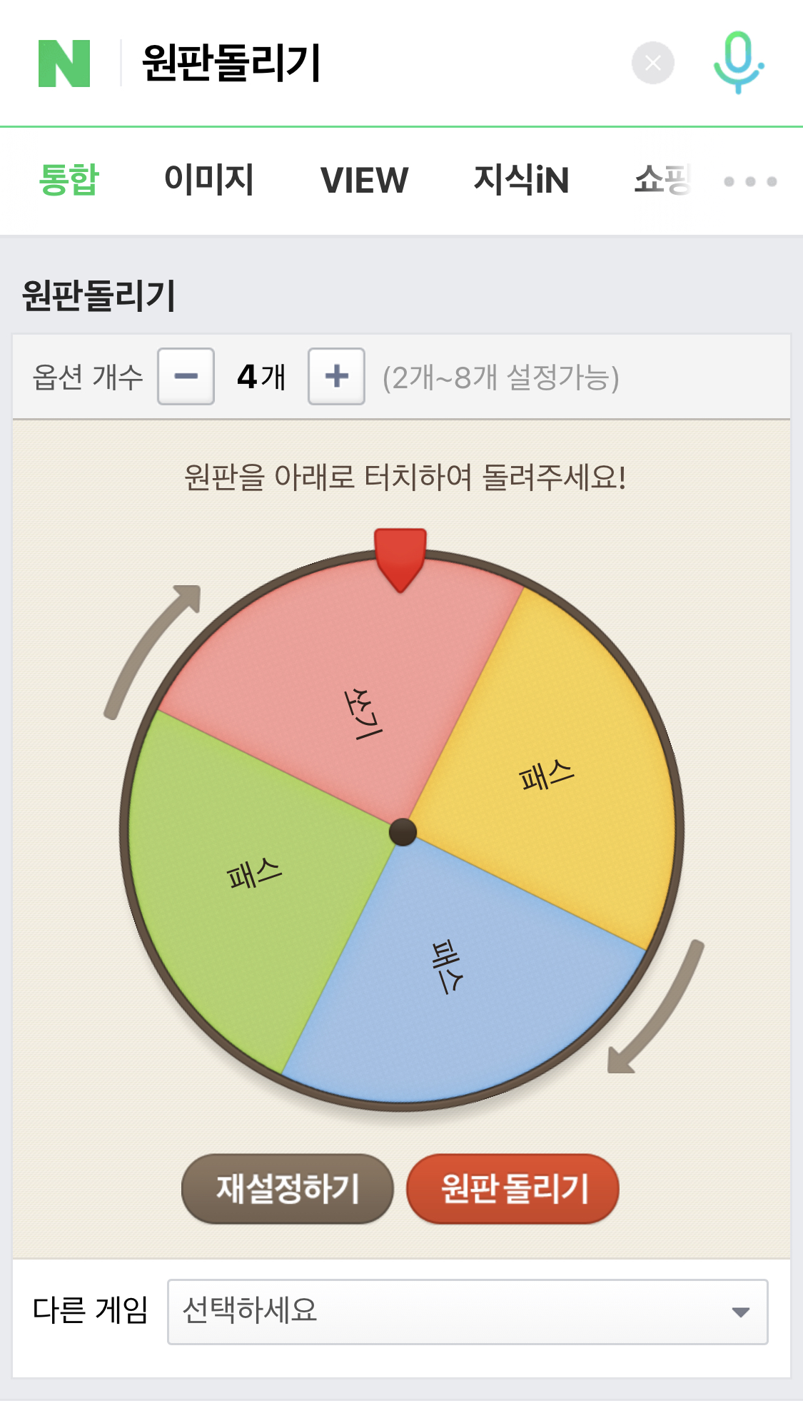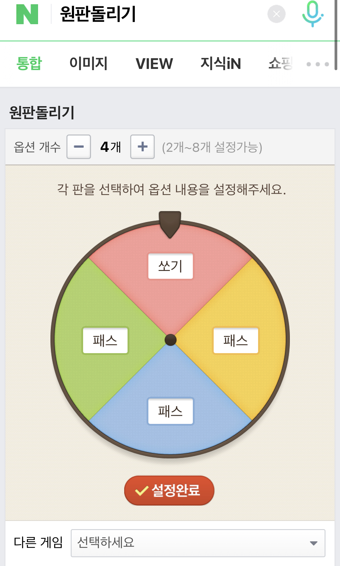 원판돌리기는 매우 간단합니다. 옵션을 선택할 수 있습니다. 전 옵션을 4개로 했지만 좀 더 걸릴 확률을 높이기 위해서는 옵션을 2개로 선정을 한다음에 '패스, 당첨' 이렇게 하면은 걸릴 원판의 범위가 더욱 넓어지겠죠? 자신이 원하는 벌칙을 작성한 후에 설정완료를 누르고 원판 돌리기를 누르면 결과값을 볼 수 있습니다.