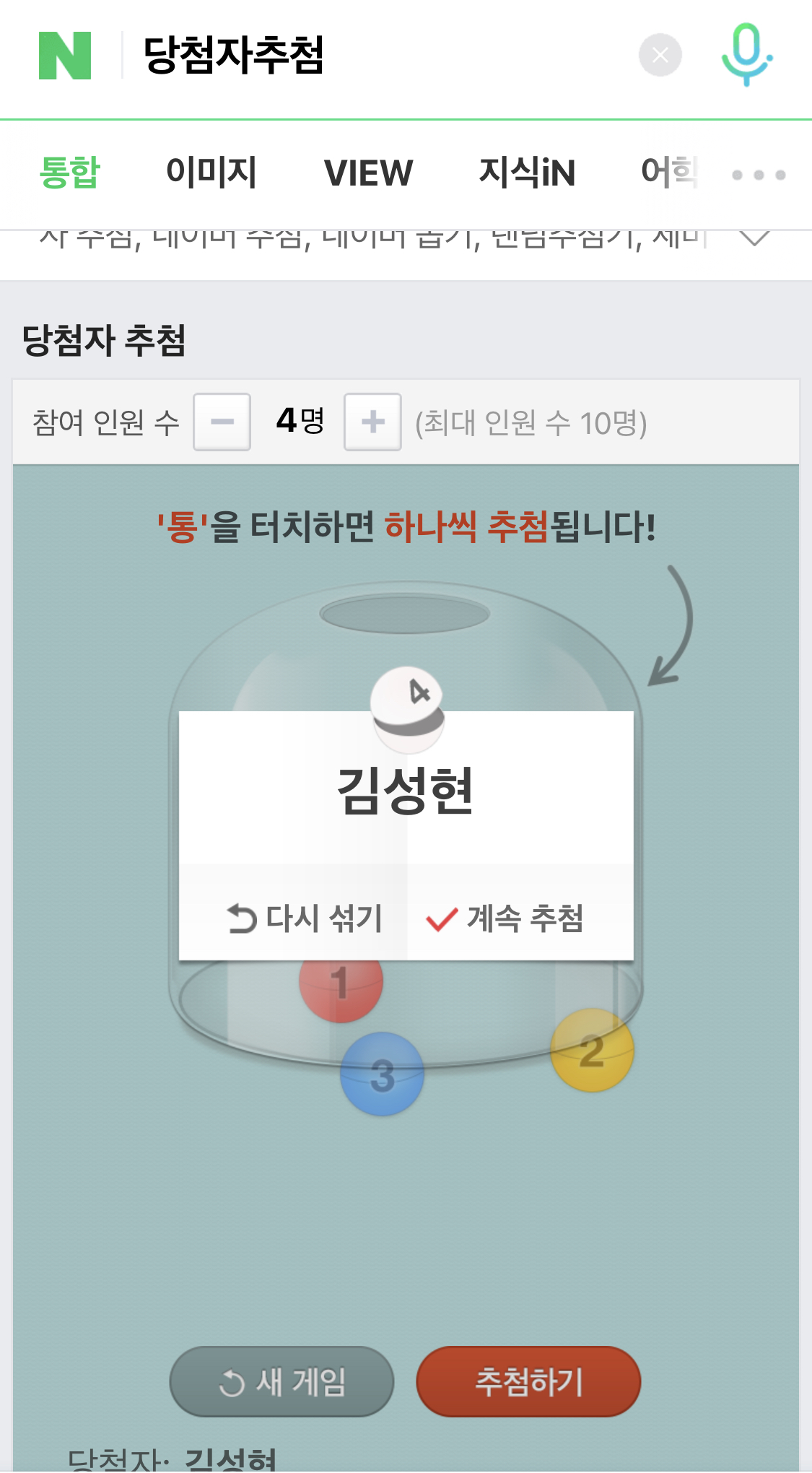 설정완료를 누르면은 추첨된 사람이 뜹니다. 저같은 경우에는 '김성현'이 추첨으로 떴네여! 말이 추첨이지 이렇게 나온 사람이 커피를 쏘면 되겠죠? 아쉬운거는 조금 더 공이 굴러가는 시간을 주면 좋은데 한번에 팍 떠서! ㅋㅋ긴장감이 살짝 떨어졌네여!