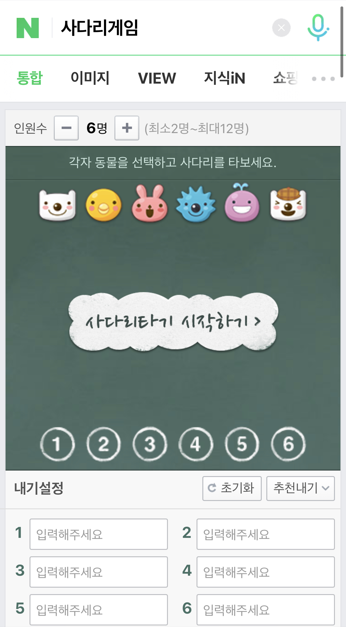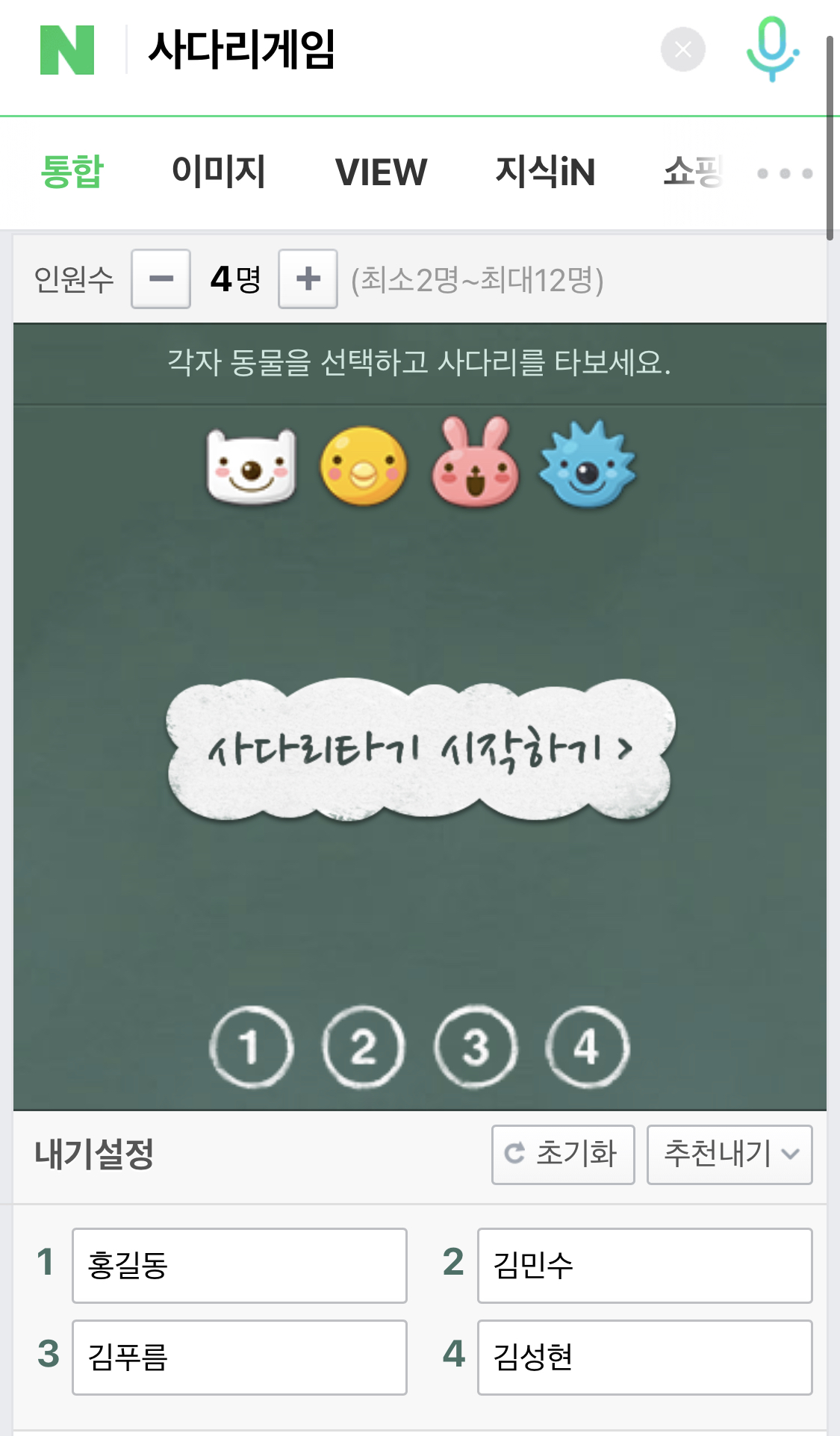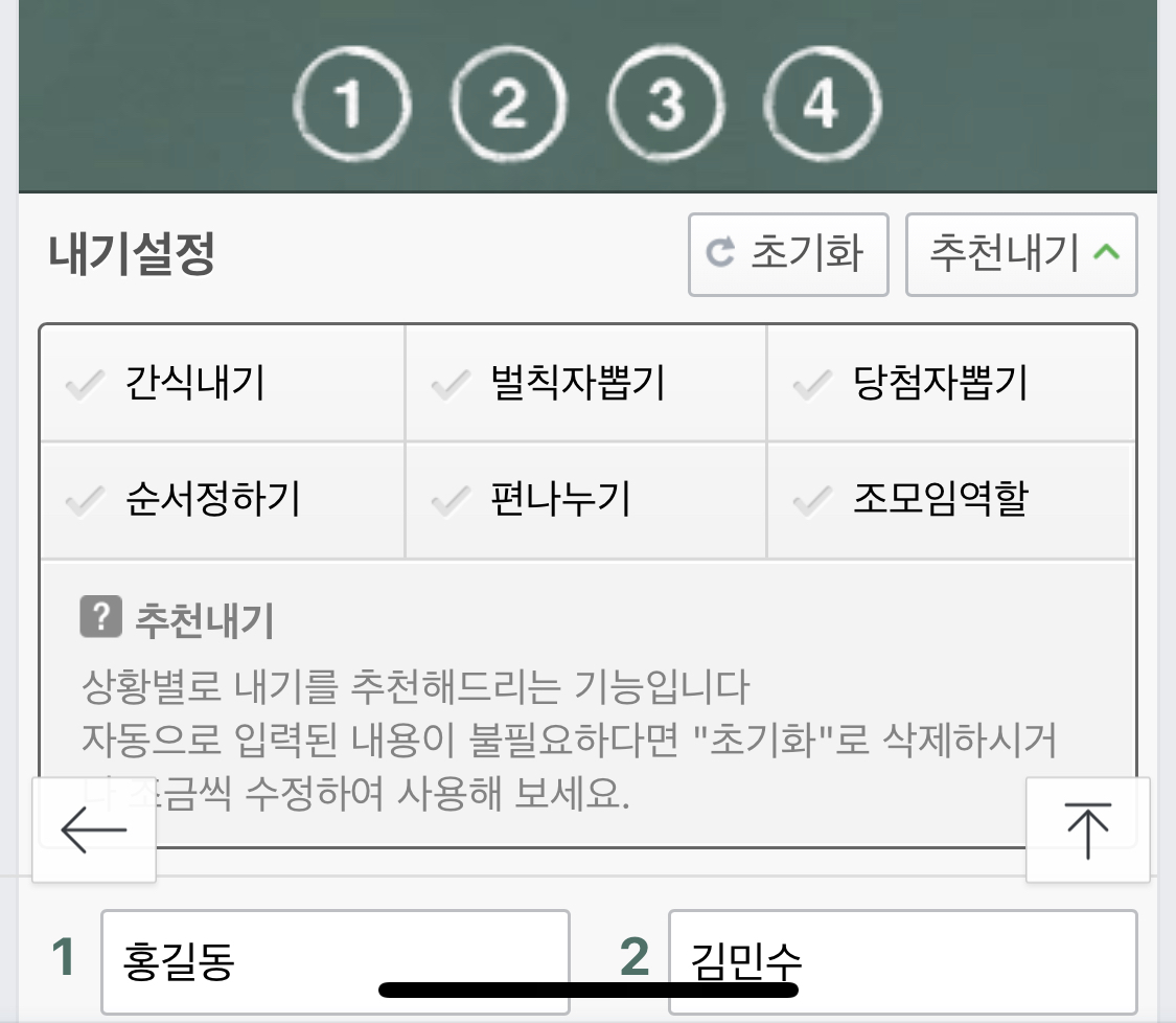 우선 인원수를 선정한 다음에 입력해주세요란에 내기에 참여할 수 있는 사람들의 이름을 작성합니다. 인원을 넣은 후 게임에 참여하고자하는 사람들의 이름을 집어 넣습니다.