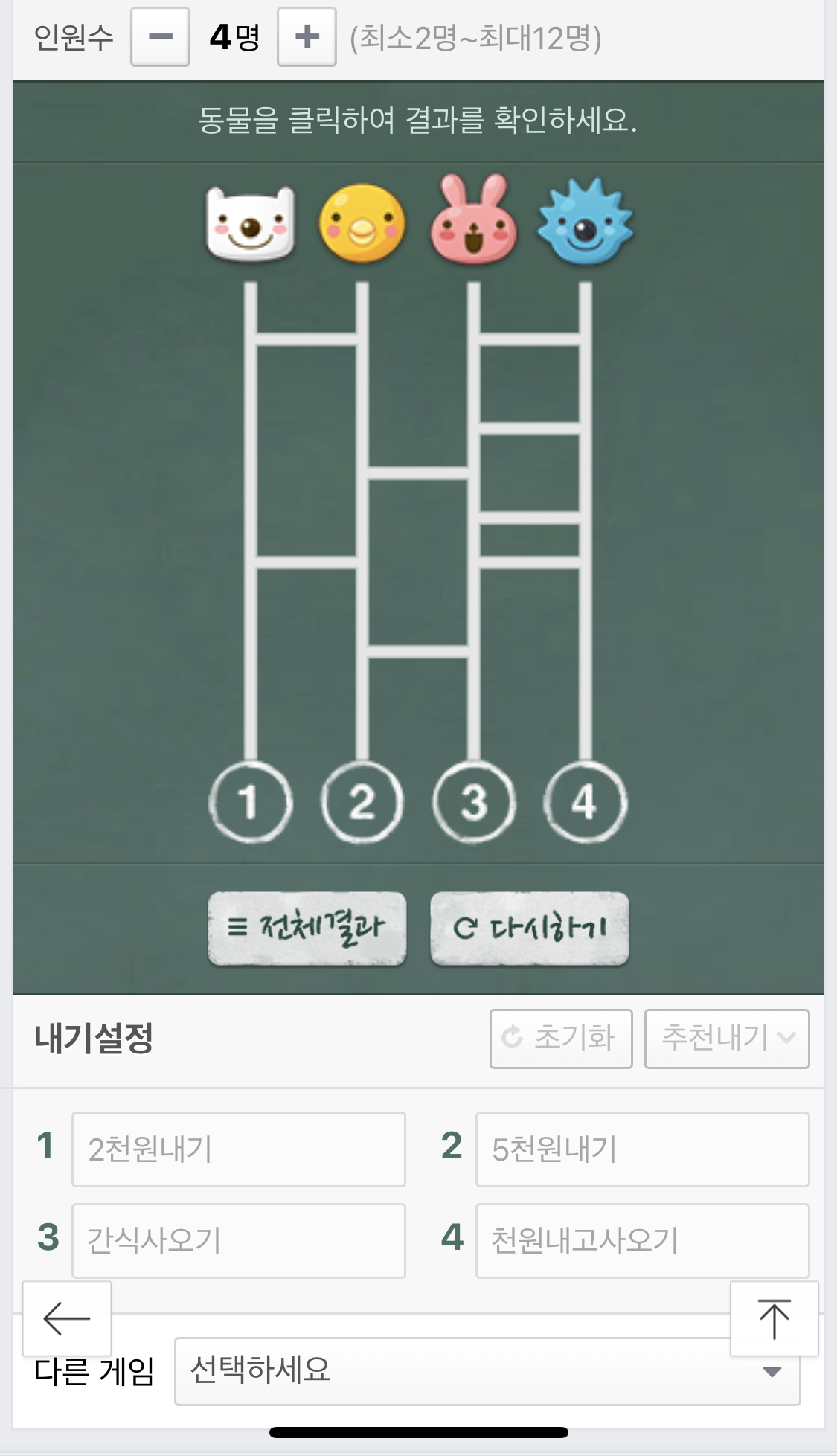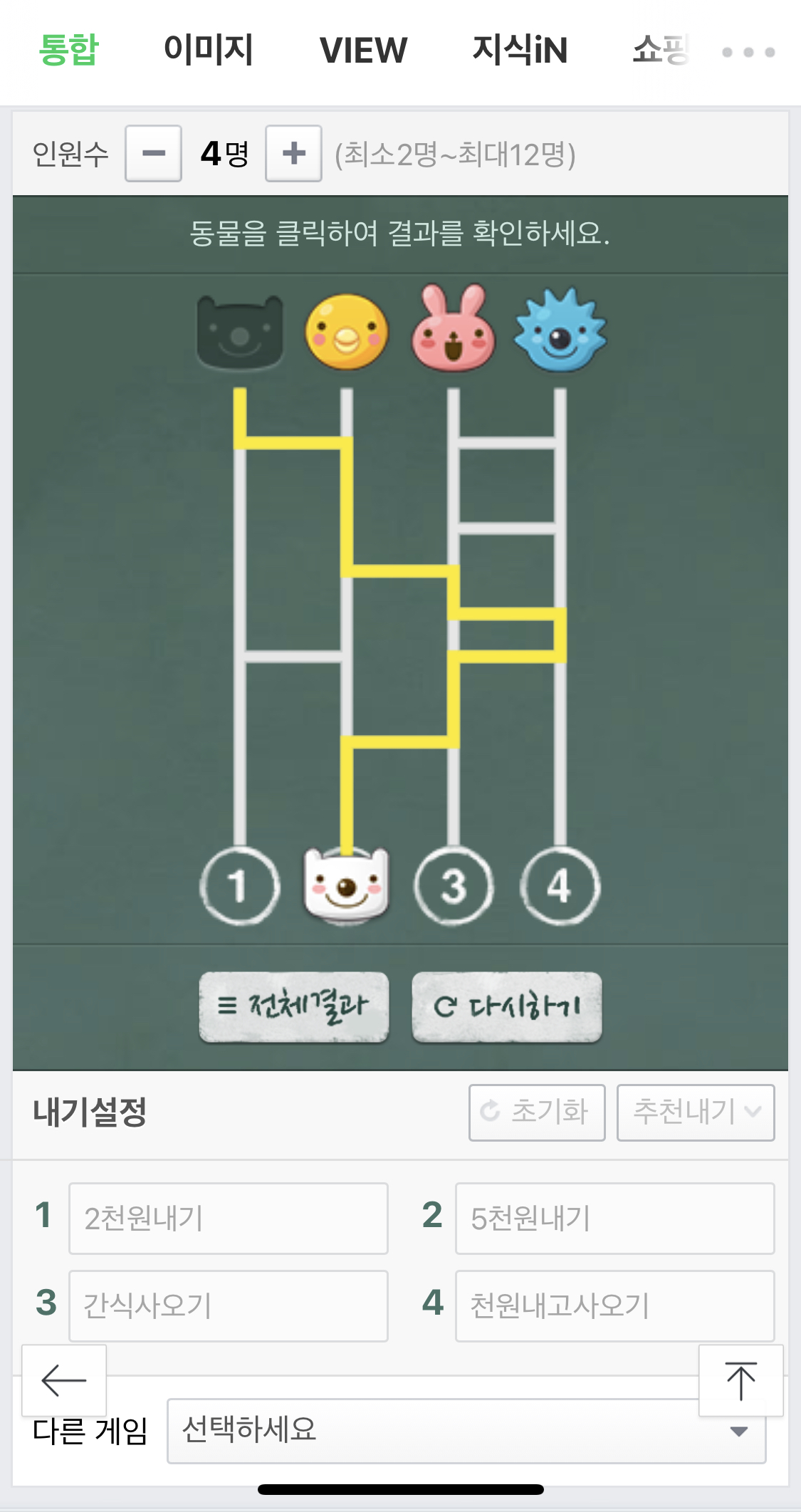 저는 내기 설정에 간식내기를 해서 '2천원내기, 5천원내기, 간식사오기, 천원내고사오기'를 설정을 한 다음에 위에 있는 캐릭터를 누르면은 아래 사다리를 쭉 탑니다. 4명이니깐 4명 전부 사다리가 완료되었으면 '전체결과'를 볼 수 있습니다. 위와 같이 결과값을 볼 수 있습니다. 네이버 복불복내기 어렵지 않죠?