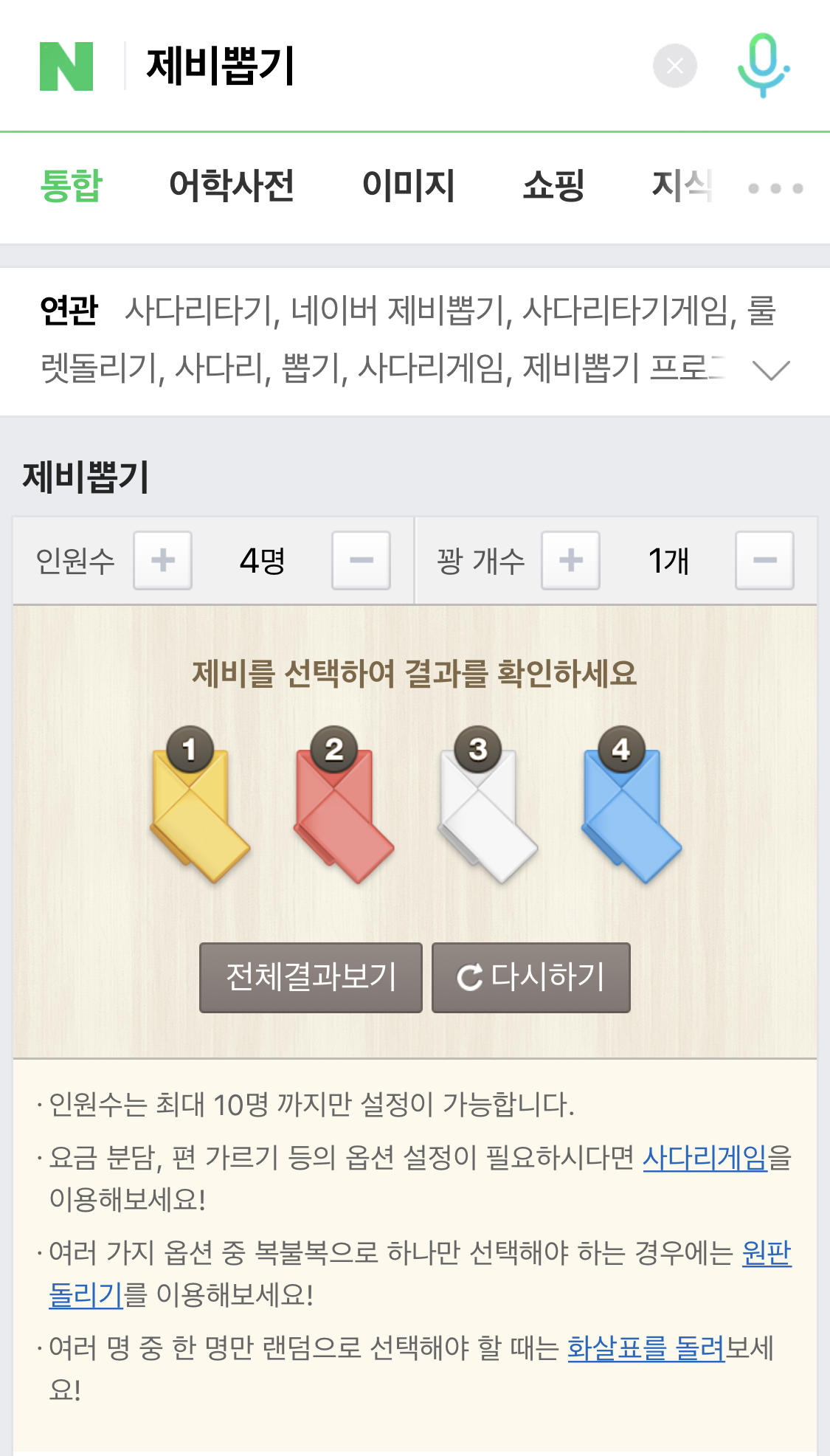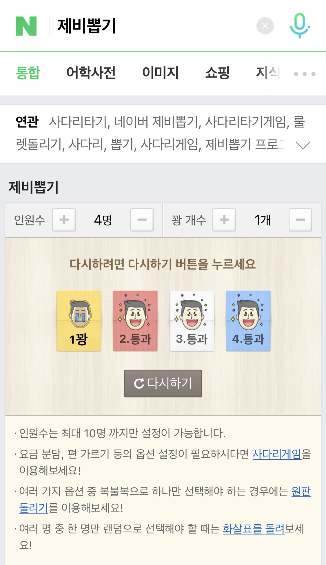 제비뽑기는 인원수와 꽝수를 정합니다. 만약에 4명중에 2명이 걸리길 원하면은 인원수 : 4명, 꽝 개수 : 2명으로 설정을 하면 됩니다. 전 예시로 보여드리면 4명이서 1명이 커피쏘기를 한다면은 인원수 4명, 꽝 개수 1명으로 설정을 합니다. 그리고 제비(쪽지)위에 숫자가 있는데 한사람씩 누릅니다. 결과값을 보시면은 노랑색 제비가 '꽝'인거 보이시죠? 이런식으로 가위바위보를 해서 서로 뽑기를하면 재미날 것 같네여! 네이버 복불복게임 꿀잼이죠?
