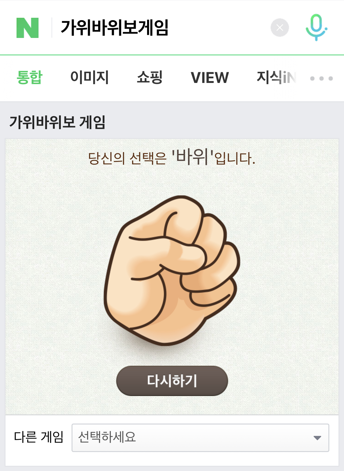 가위바위보 게임은 선택을 한 다음에 가위,바위,보가 무작위로 나타납니다. 랜덤게임이겠죠? 실제 가위바위보를 내는 것 보다는 하나한 선택을 해서 진 사람이 쏘는 방법입니다. 하지만 가위바위보 게임은 굳이 이럴 필요 없이 시간과 재미를 위해 실제로 하는게 더욱 나을 것 같습니다. 저는 시험삼아 해보니깐은 '바위'가 나왔네여