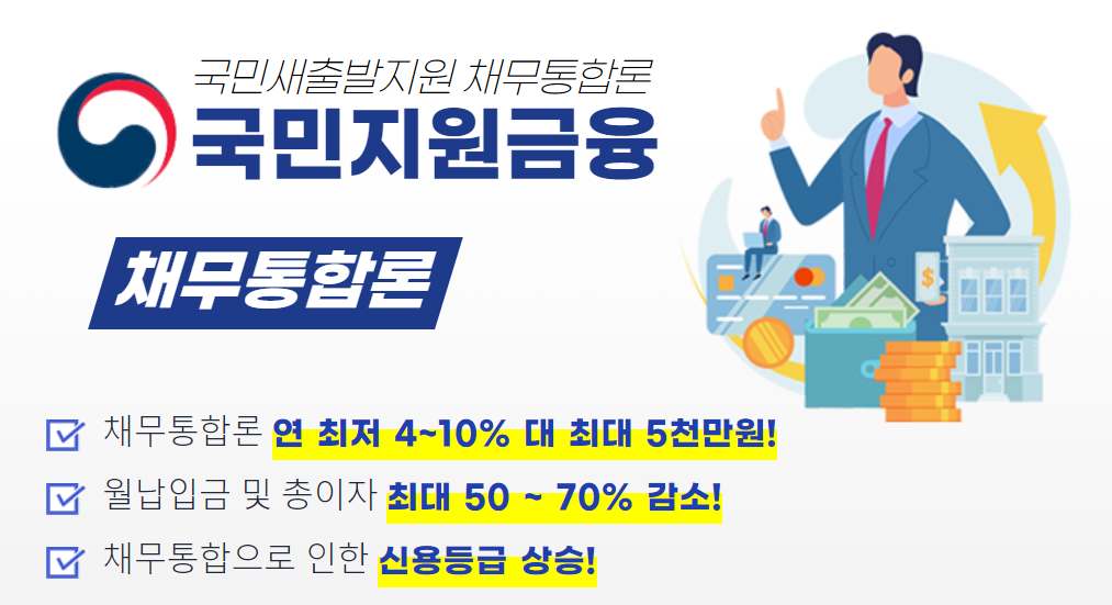 채무통합을 위해서 SBI 중금리 대환, 오케이저축은행 갈아타기 OK론, 피플 펀드론, 햇살론 채무통합 대환대출 등도 있지만은 '국민새출발지원 채무통합론'으로 채무통합론 연 최저 4%~10% 대 최대 5천만원, 월납입금 및 총 이자 최대 50%~70% 감소, 채무통합으로 인한 신용등급을 노릴 수 있는 정부지원 상품도 있습니다.