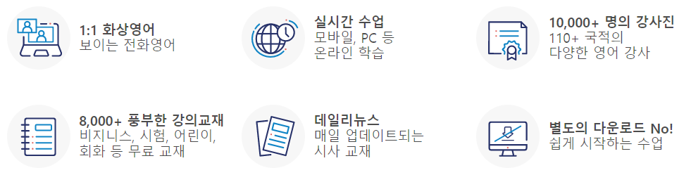 추가적으로 8,000+개 풍부한 강의교재(비즈니스, 시험, 어린이, 회화 등 무료 교재), 데일리뉴스(매일 업데이트 되는 시사 교재), 별도의 다운로드가 필요 없이 편리하게 화상영어를 할 수 있는 프로그램 입니다.