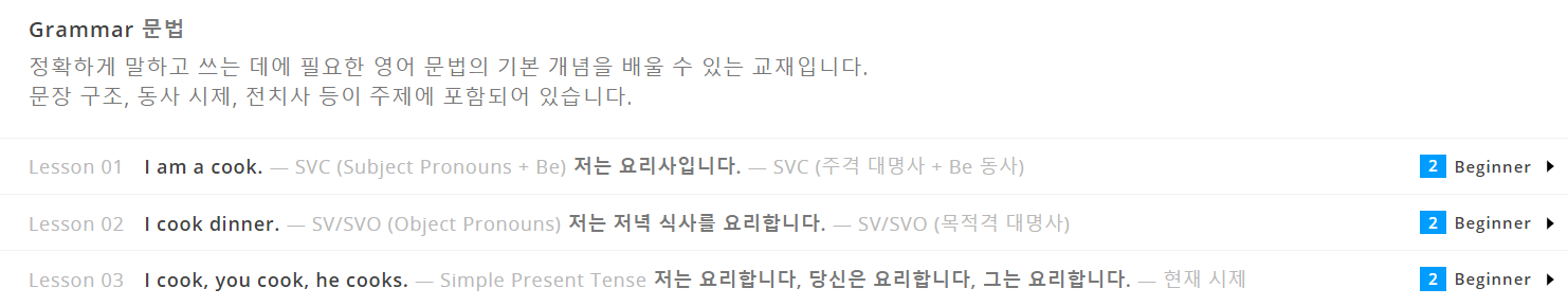 초보자에서 상급자까지 영어 문법을 이해하는데 도움을 주는 교재입니다. 정확하게 말하고 쓰는데에 필요한 영어 문법의 기본 개념을 배울 수 있고 문장구조, 동사시제, 전치사 등이 주제에 포함되어 있습니다. 기초문법부터 고급문법까지 폭 넓은 문법을 배울 수 있습니다.