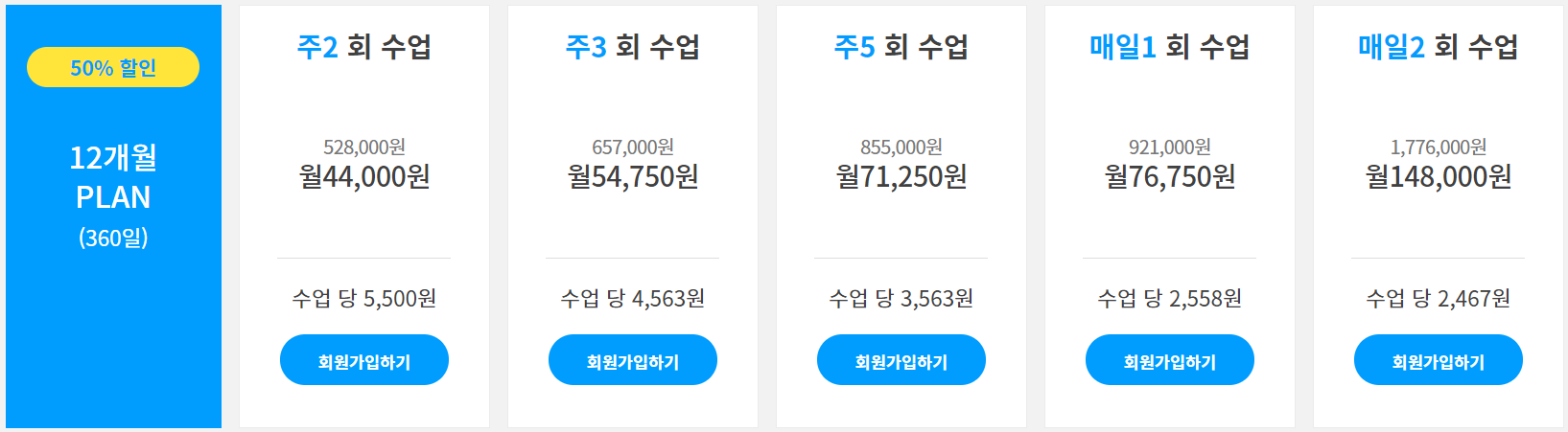 가격은 1개월, 6개월, 12개월에 따라 달라지는데 6개월은 33%, 12개월은 50% 할인이 됩니다. 카테고리는 '주2회 수업, 주3회 수업, 주4회 수업, 매일1회 수업, 매일2회 수업이 있습니다. 처음부터 저렴하다고 12개월 할부로 구매를 하지말고 우선 1개월을 해본 후에 나에게 맞게끔 오랫동안 할거면 6개월, 12개월을 정하셔서 구매를 한다면은 더욱 저렴하게 하실 수 있지 않을까 생각합니다!